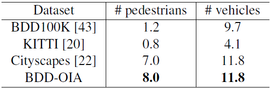차량의 주행 과정은 대부분 "Move forward" action으로 구성되어 있으며, 다른 action들은 비교적 나타나는 빈도가 낮고 수행 시간이 짧다. 본 논문에서는 이로 인해 발생되는 데이터 수의 불균형을 완화하고자 하였으며 ("Turn left"와 "Left lane change" action을 합침), 이미 존재하는 데이터셋들 중 action을 선택한 이유에 대한 annotation이 되어 있는 것은 없기 때문에 새로운 데이터셋을 제안하고 있다. 또한, 최소 5개의 주변 차량들, 그리고 5명의 보행자나 자전거가 존재하는 복잡한 scene을 선정하여 도심 환경을 타겟으로 했다.