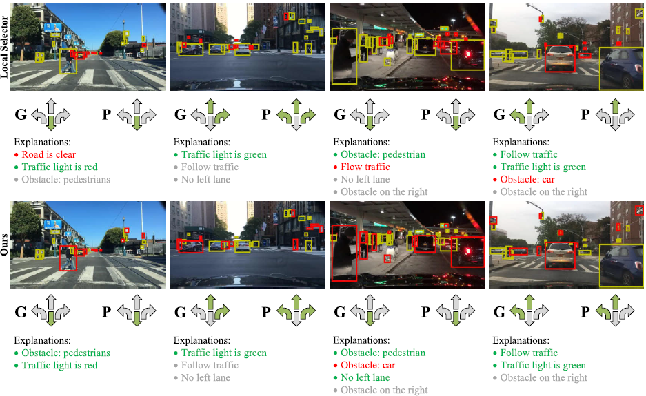 지금까지의 구조를 통해 네트워크는 scene-object 관계를 파악하고 reasoning 과정을 수행할 수 있게 된다. Global module은 global scene layout 내 object들의 spatial context를 제공하여 backbone feature map에 attention 메카니즘을 결합한 형태의 기능을 한다. Object-scene tensor가 Selector를 통과하고, Eqn.(2)의 loss function을 통해 전체 모델이 학습됨에 따라 global feature map은 차량의 action 선택과 관련이 많은 object일수록 높은 점수를 부여하고, 중요하지 않은 object들은 무시할 수 있도록 학습된다.