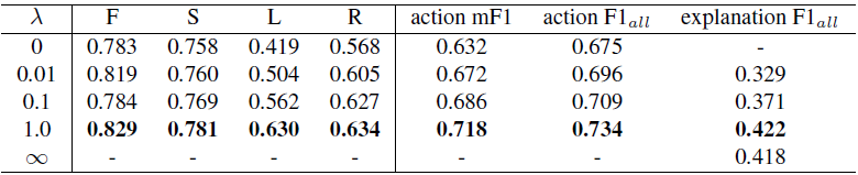 (( \lambda ))를 변화시키면서 action, explanation prediction에 미치는 영향을 조사했다. 그 결과는 Table 3에 나타나 있으며, (( \lambda = 1 )), 즉 explanation에 action만큼의 중요도를 부여했을 때 가장 높은 성능을 보였다. 따라서, explanation의 존재는 모델의 action output에 대한 설명을 부여할 뿐만 아니라, 전체적인 accuracy를 높이는 효과도 갖는다는 주장을 하고 있다. 자세한 내용은 논문의 5.2절을 참고하자.