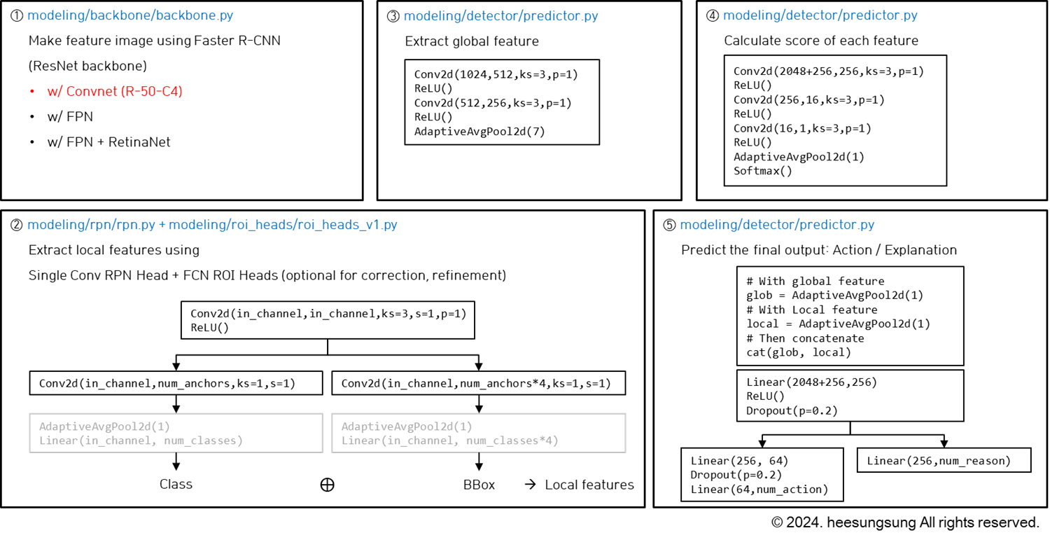 본 논문에서 제안하는 모델의 전체 구조는 Figure 3과 같다. 전방 카메라의 RGB image를 input으로 받으며, 단일 step의 single frame만을 사용한다. 가장 먼저 image의 backbone feature를 뽑아내며, 이후 두 가지 모듈로 나뉜다. Local feature (( t_{l_i} (i=1,2,...,N) ))는 Faster R-CNN의 RPN과 ROI head layer로부터 생성된다. Global feature (( t_g ))는 size 및 dimension을 processing하여 local feature와 결합되고, scene context와 object-scene relationship 정보를 포함한다. 이렇게 계산된 feature 정보는 Action-Inducing Object Selection Module로 들어가 최종적으로 action (( \hat{A} ))과 explanation (( \hat{E} ))을 예측한다.
