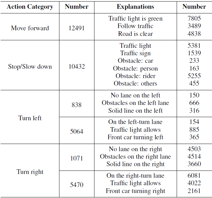 본 논문에서는 e2e 자율주행 시스템에서 주로 사용되는 4가지 action을 선택했으며, 총 21가지의 explanation을 선정하였다. 구체적인 내용은 Table 1에 나와있다.