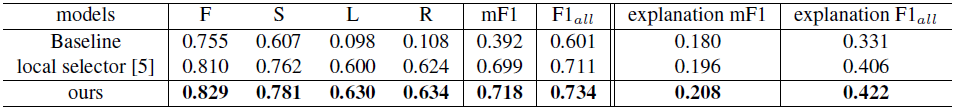 여기서, (( \mathcal{L}_A=\sum_{j=1}^{4}L[\hat{A}_j,A_j] )), (( \mathcal{L}_E=\sum_{j=1}^{21}L[\hat{E}_j,E_j] ))이며, (( A_j ))와 (( E_j ))는 각각 (( j^{th} )) action과 explanation의 GT label을 의미한다. (( L[\cdot,\cdot] ))은 binary cross entropy loss, 그리고 (( \lambda ))는 action과 explanation error간 상대적 중요도를 control하는 hyperparameter이다.