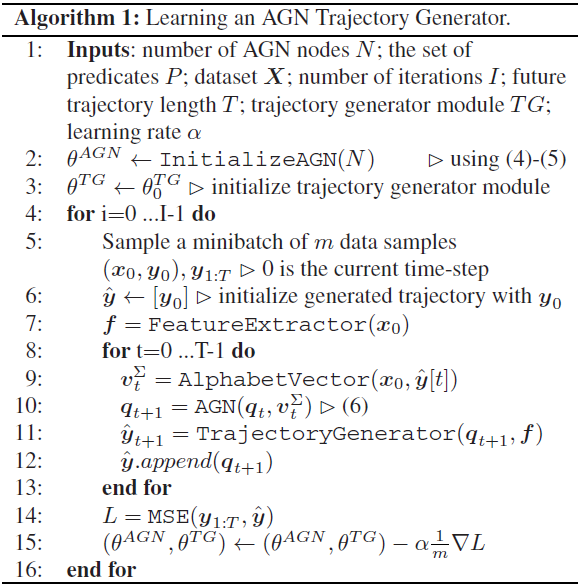 이 논문에서 제안하는 장점 중 하나로, TGM은 다양한 종류의 네트워크가 될 수 있다. 여기서는 LSTM 계열의 모델을 사용했으며, 다음은 AGN decoder를 학습하는 알고리즘이다.