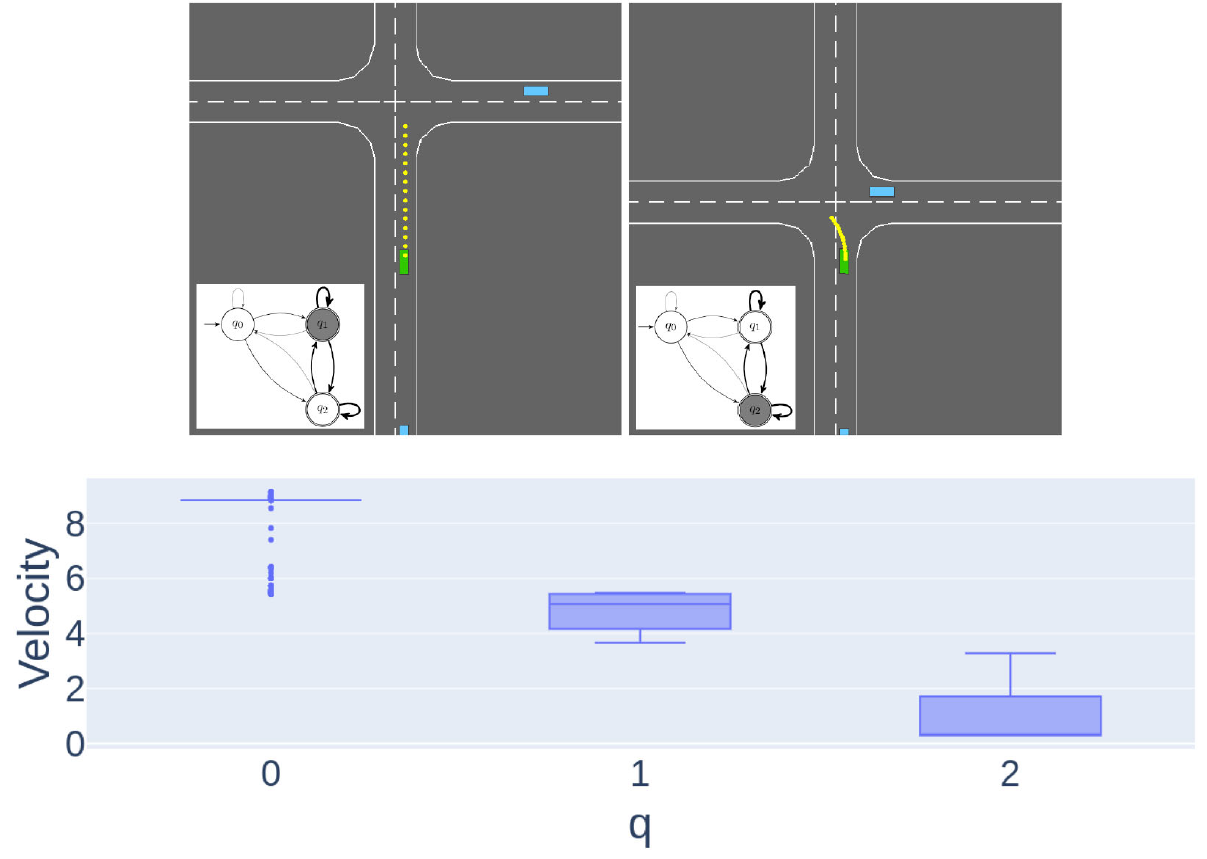 Fig. 6-(b)는 비보호 좌회전 시나리오이다. State ((\mathbf{q}))는 3차원의 vector이며, 각 성분은 각각의 state에 속할 확률을 의미한다. 왼쪽 아래 automaton의 배경 투명도는 그 확률을 의미하며, 진할수록 큰 값을 가진다.